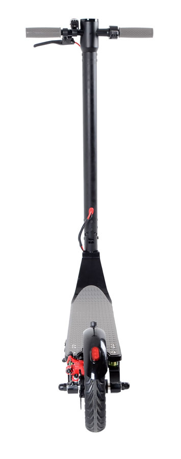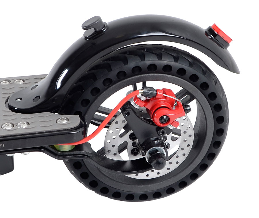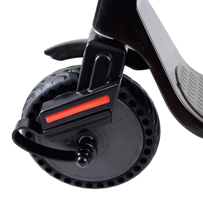 With the powerful front light you can drive safely even in the dark. The rear light also serves as a stop light. The scooter is reliably stopped by the dual brake. When braking with the rear disc brake, the front electronic brake is automatically activated, which increases braking efficiency and saves brake pads.