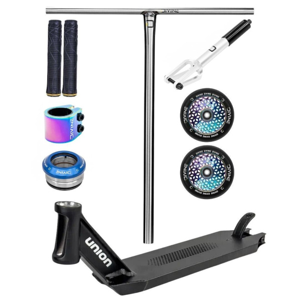 We built this custom to meet the demands of riders who are looking for a reliable and lightweight park setup. The foundation is the lightweight Union Honeycomb board, which is known for its strength and clean design. The speed and smooth ride are ensured by the Divine Light Core 110 mm wheels along with the precise IHC Divine fork and the smooth operation of the Divine Backflip headset. Steel T-bars Divine Standard provide the scooter with stability and control even during more challenging tricks.