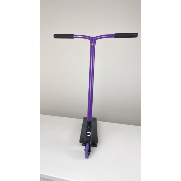 This unique build-up is designed for intermediate to advanced riders who love street/park environments. The total weight of this scooter is an impressive 4300 grams, which is an amazing parameter for its size and the material used. On this scooter, we find a Divine Street deck with dimensions of 520 x 153 mm (length x width) and a footspace of 400mm. We chose the Union Uniq Bend Oversized handlebars, made from strong material, with dimensions of 670x580mm. The handlebars are fitted with Fiction Troop grips in black. The entire assembly is connected using the HIC compression system, which securely holds all components in place.HIC is connected with the Divine fork, which ensures reliability and strength with every impact. The headset includes reliable Divine bearings, which ensure smooth spinning for all tricks. Regarding the wheels, the scooter is equipped with 110mm Union Turbomatic V2 with aluminum cores in a combination of black and purple colors. The entire setup is completed with the stylish and sturdy Triad Conspiracy clamp.