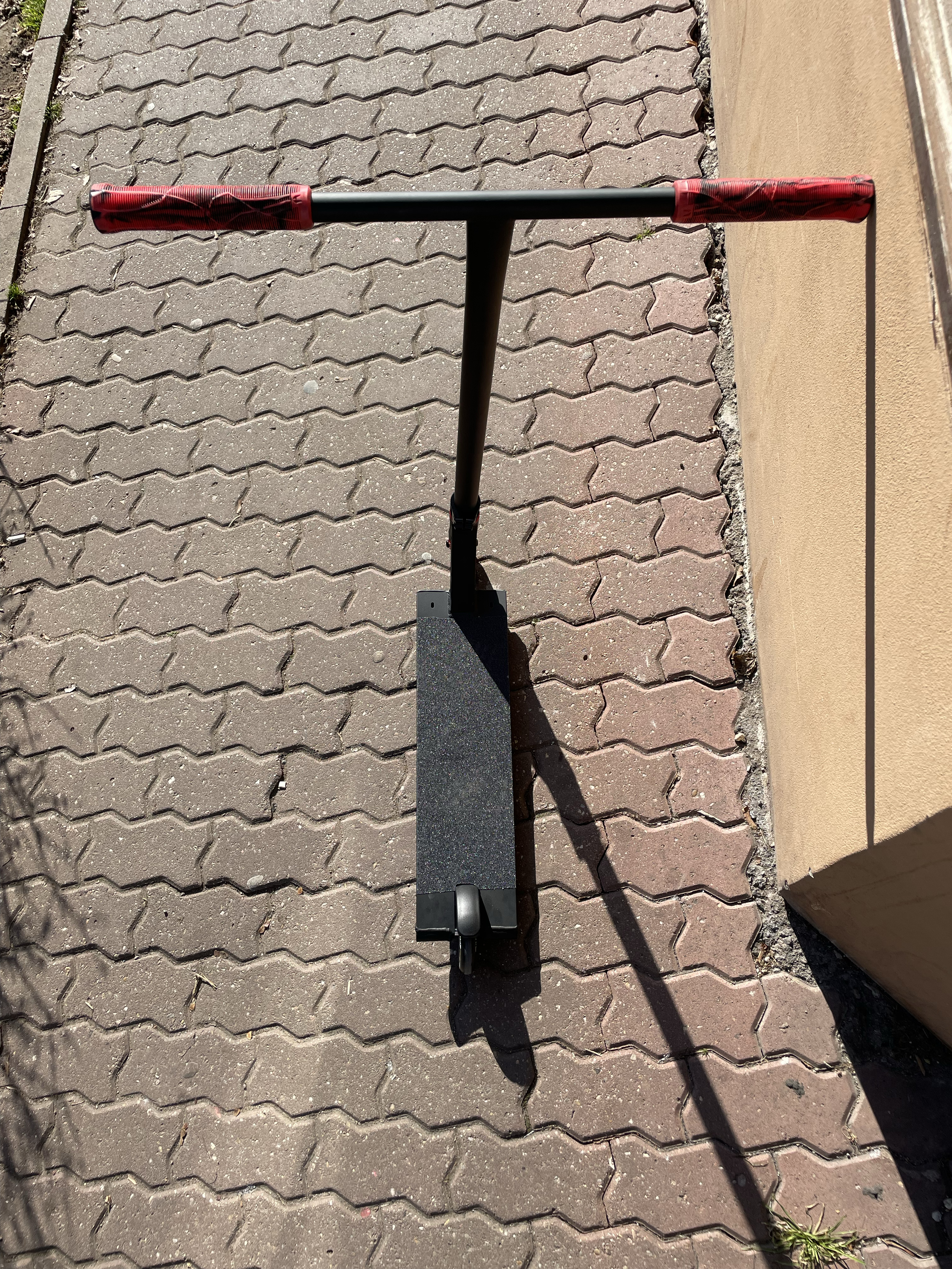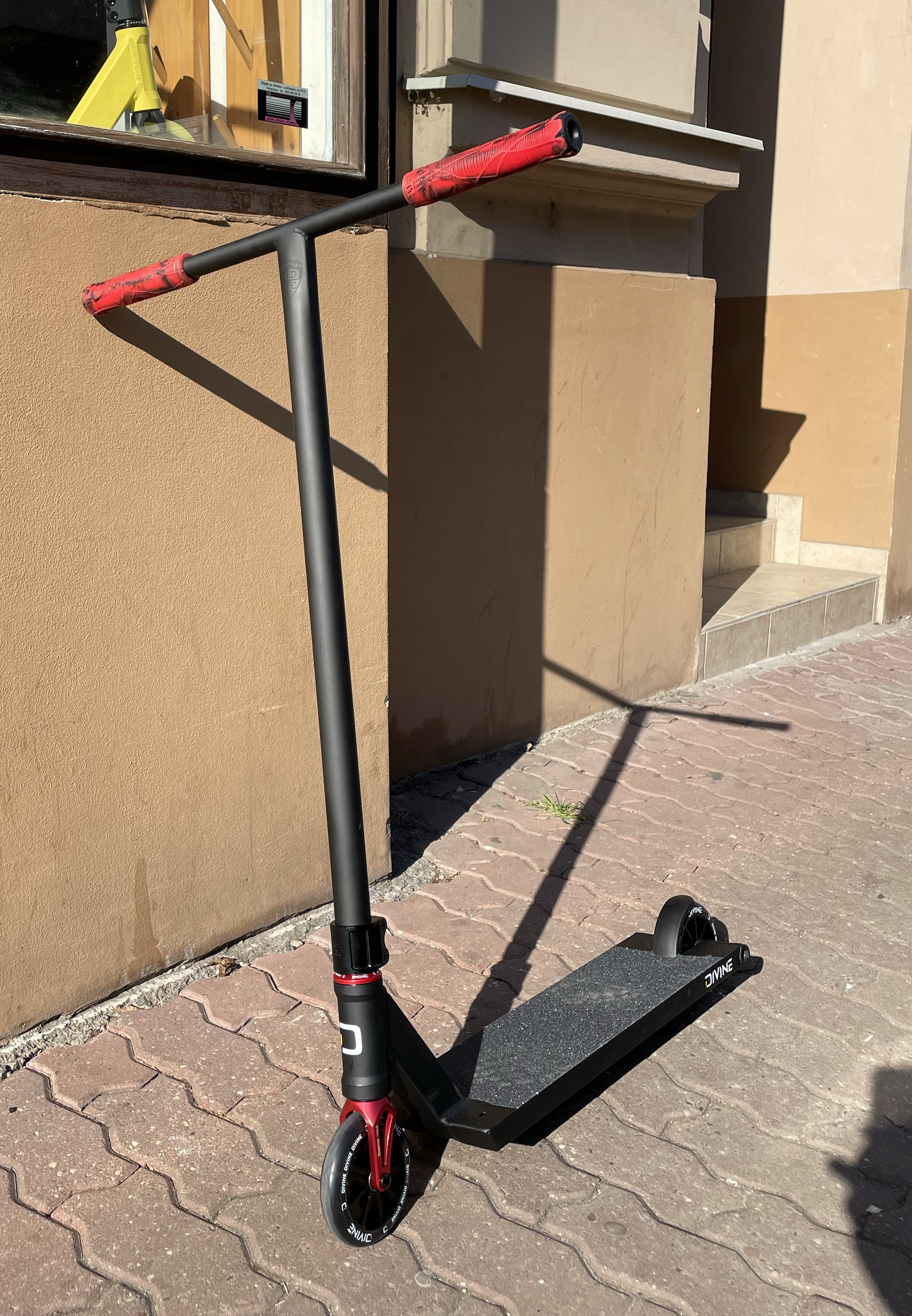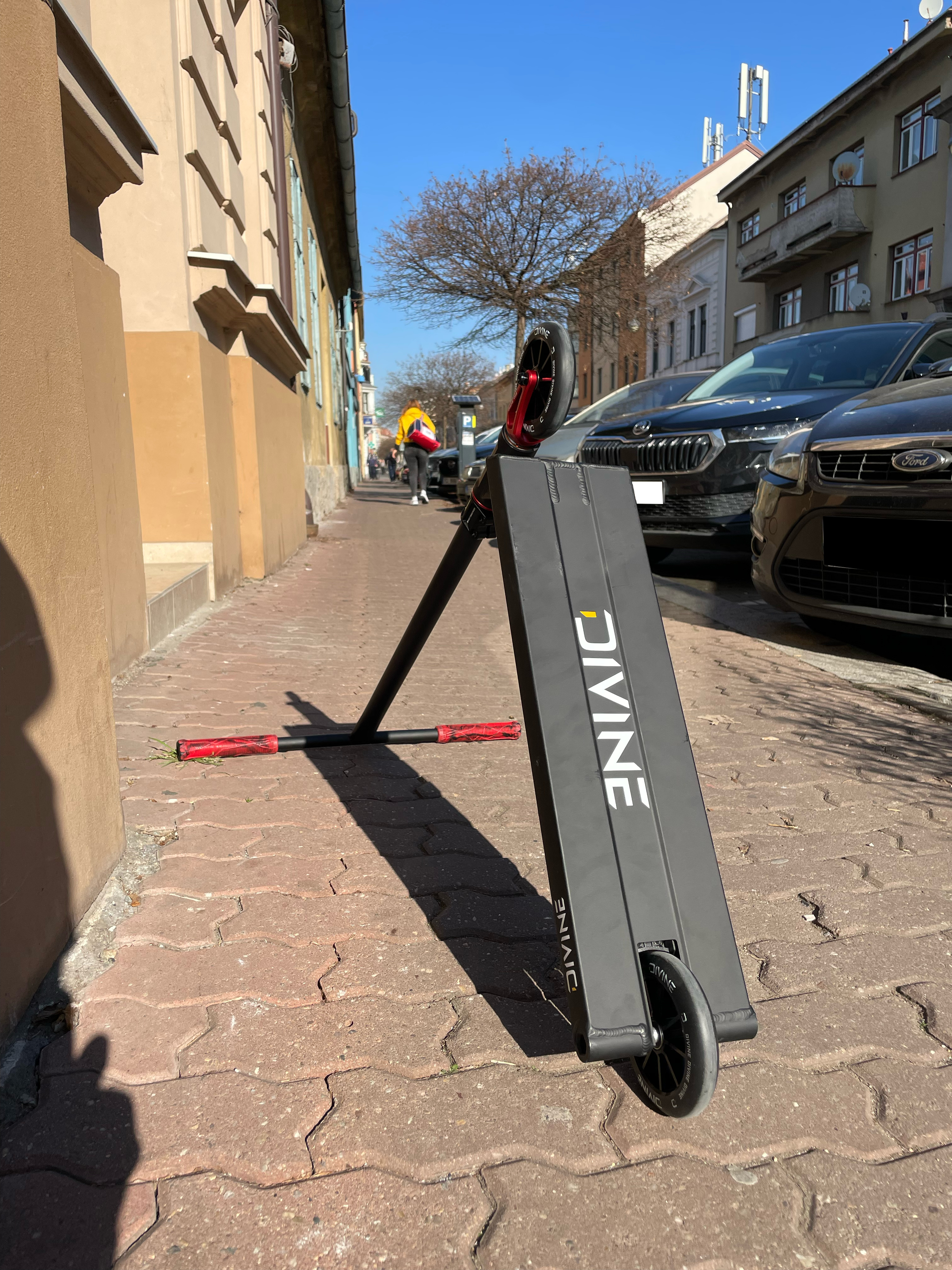 The foundation is a Divine Street board with a length of 560 mm, which provides the ideal balance between maneuverability and stability. It is equipped with Ethic Tenacity handlebars with a height of 770 mm, ensuring excellent control during tricks and a comfortable stance. The comfortable grip is ensured by Ethic Slim grips in red color, which fit perfectly in the hand. The scooter is held firmly together by a Root Industries clamp in black. The smooth rotation is ensured by the Divine Backflip headset in red, which is equipped with high-quality bearings.