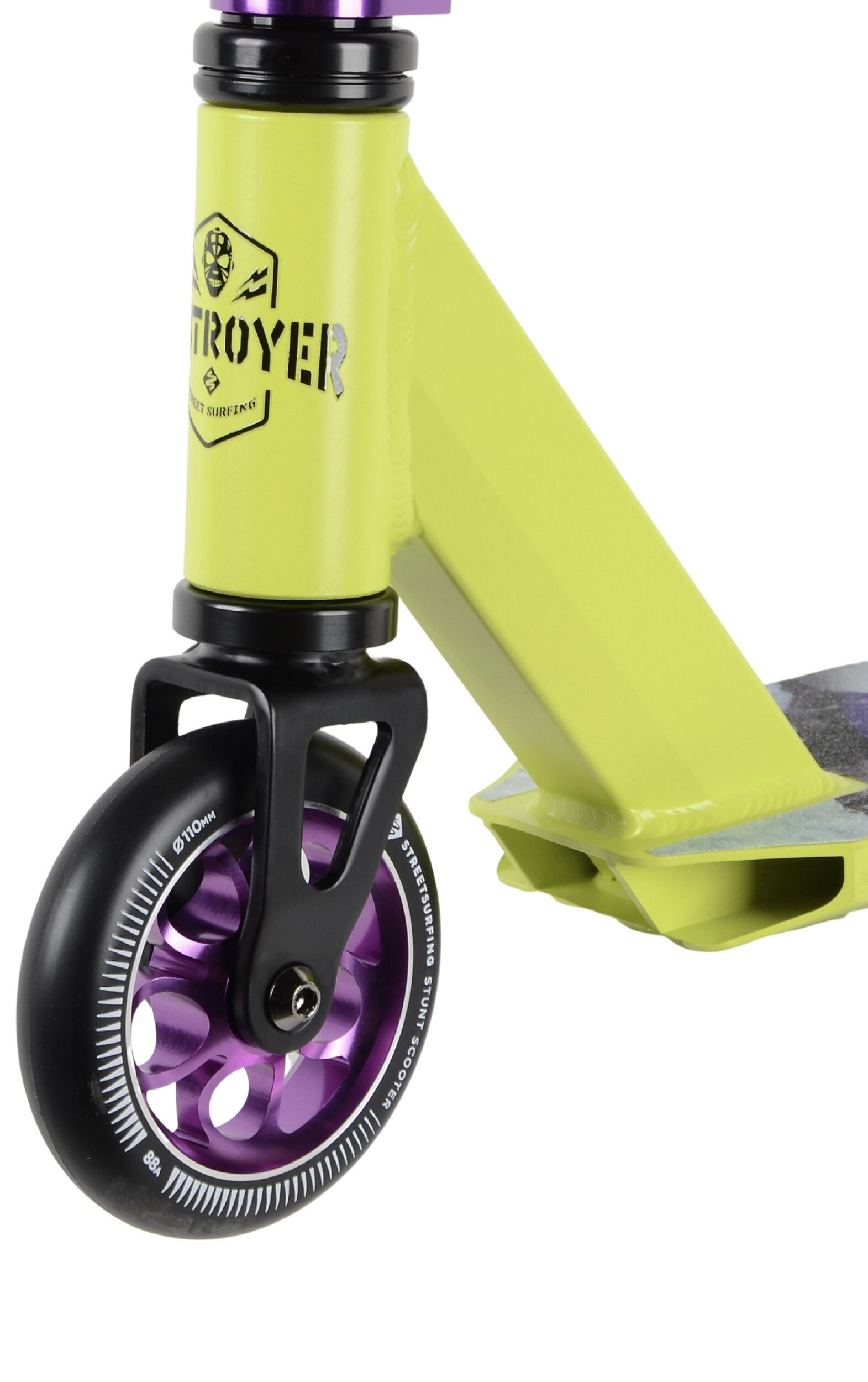 In conjunction with ABEC 9 bearings, they provide a fast and smooth ride, good responsiveness, and better acceleration. The safe deceleration is managed by a steel springless flex fender brake.If you are looking for a freestyle scooter that is not just for complete beginners, but at the same time not unnecessarily excessive for hobby riding, the Street Surfing DESTROYER Yellow Propaganda is a very good choice. It offers a good balance between weight, strength, speed, and maneuverability — and also impresses with its striking design.