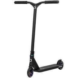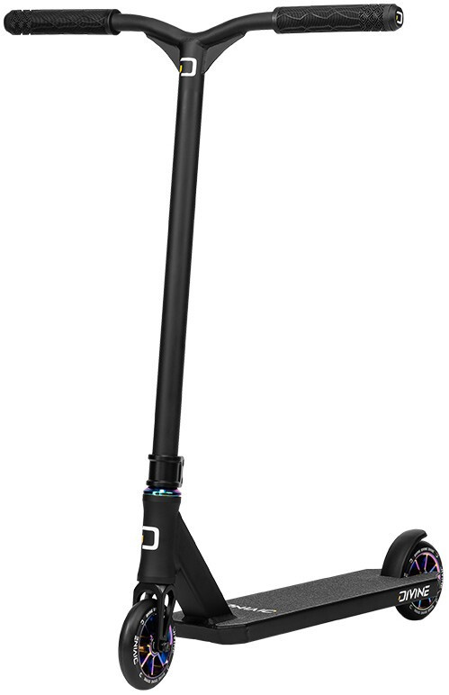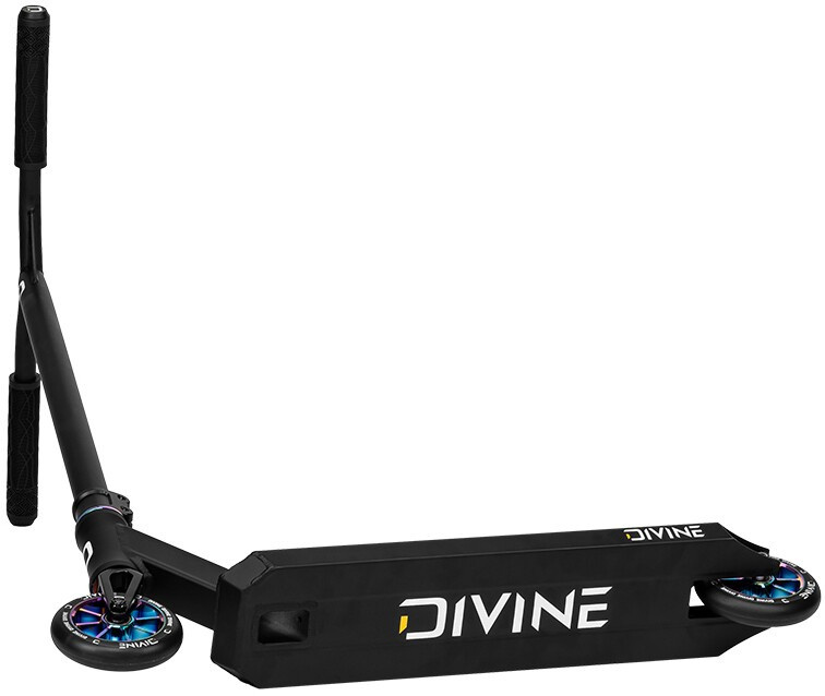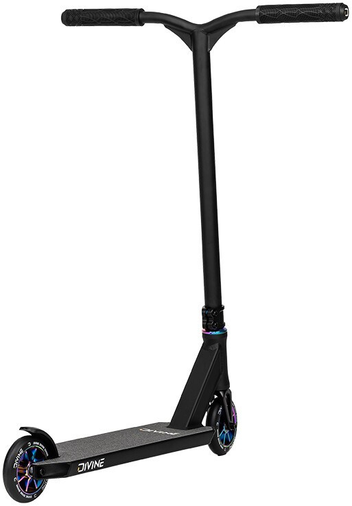 Are you an intermediate rider with a height between 130 - 160 cm and want a freestyle scooter for skatepark? We have a solution for you Divine Loki is a great choice as it weighs 3,6 kg and has super dimensions. The scooter is fitted with steel handlebars with a Y-shape that prevents bending and has comfortable grips. The sleeve has 2 bolts and that fits beautifully on the one piece aluminum fork. Smooth and especially quiet operation of the scooter is ensured by industrial bearings, which are integrated in the neck of the board. The board is lightweight and can be ridden both skatepark and basic stream. The board has a plastic foot brake. The scooter includes a pair of 110 mm spoked wheels with aluminium centres.