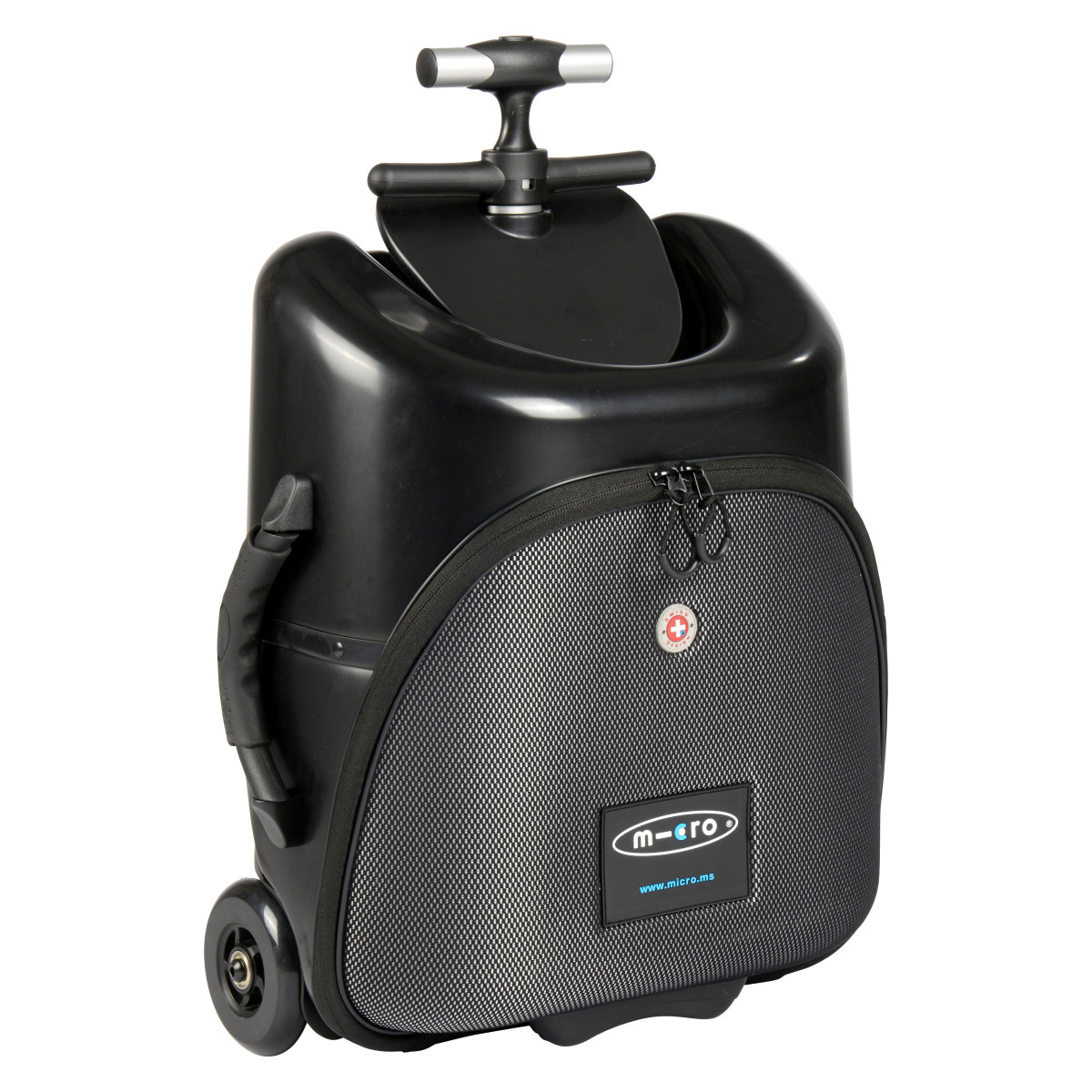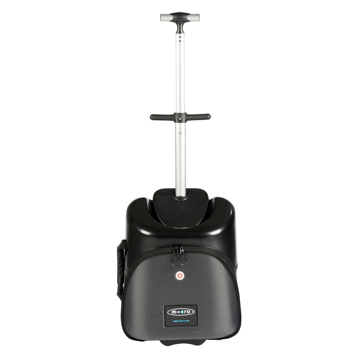 Micro Lazy Luggage is a bag / suitcase with a capacity of 18 liters on which you can comfortably seduce your child. Forget the stroller or long journeys with a child in your arms and take a Micro Lazy Luggage with you, which will help you with things or shopping and can also turn into a means of transport. If the children are not with you, you can fold the front structure with wheels and use the suitcase on wheels as a shopping aid or as hand luggage when traveling. Thanks to the height-adjustable handle, your child can also comfortably guide the suitcase folded in this way. Lazy Luggage is very easy to handle when folded and unfolded (baby carriage). Shopping and traveling with children thus turns into real fun. Chassis: The chassis is from the Micro workshop, it is aluminum with plastic elements. It can be easily folded. The pull-out handle has a total of 3 positions - fully retracted 57cm, extended 83cm and fully extended 108cm (measured from the ground). The weight of the chassis itself is only 1.9 kg. The main wheels have a diameter of 110mm, the secondary, tilting wheels have a diameter of 65mm. Suitcase: The suitcase is from the Samsonite workshop, it is plastic with textile accessories. It has an ergonomically shaped rubberized handle on the side, thanks to which the suitcase can be carried in the hand as hand luggage / bag after inserting the adjustable chassis handle. The suitcase has one main zip pocket with sliders that can be locked. The main pocket of the suitcase is divided into 2 side compartments, one of which is equipped with a strap for better attachment of clothes and the other is equipped with a padded compartment for a minibook or tablet. Inside the suitcase there are also several other, smaller compartments for small things, etc.Read more