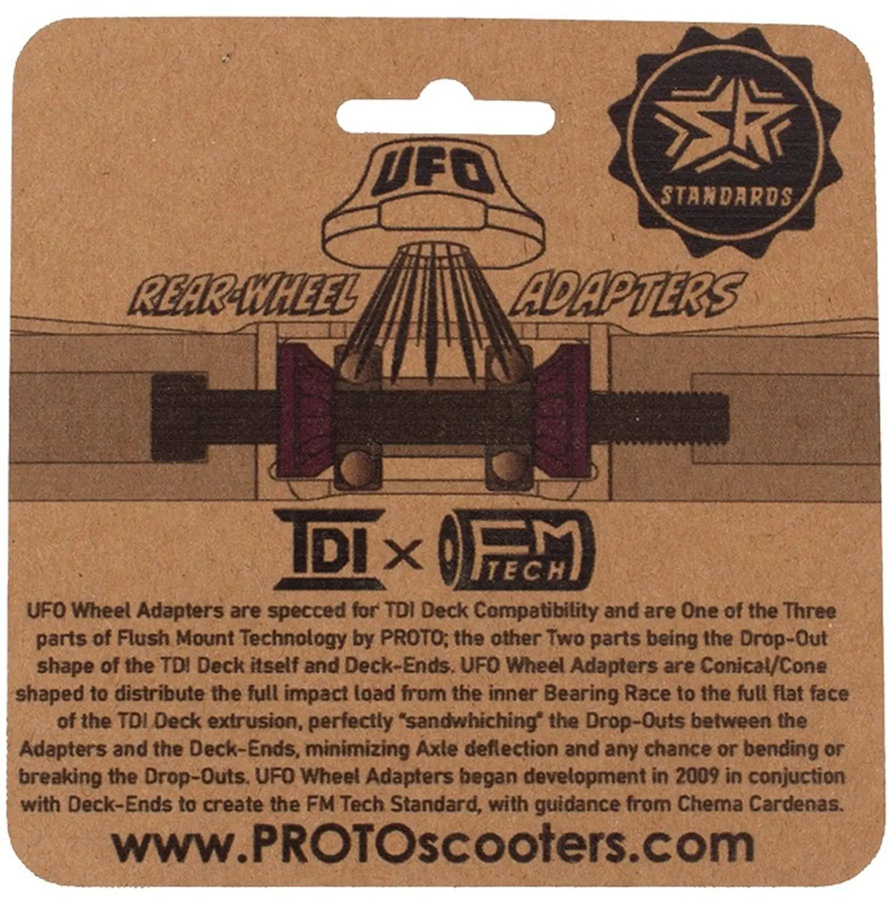 Sada 2-balení adaptérů na zadní kola Proto UFO umožňuje kompatibilitu s jakýmikoli koly na vaší PROTO TDI desce. Tyto adaptéry jsou vhodné pro kola o šířce 24 mm a 30 mm, stejně jako pro Osičky o průměru 8 mm a 12 mm, a zajišťují dokonalé uchycení. S těmito adaptéry lze kola vyžadující 12mm Osičky snadno přizpůsobit standardním 8mm Osičkám bez dalších dílů nebo úprav.