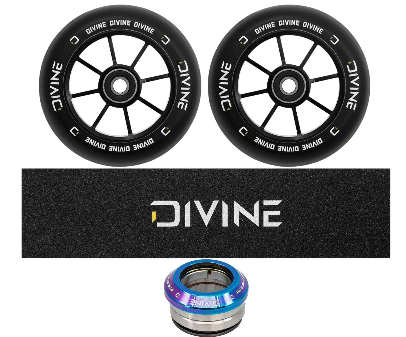 Description Set of 2 Divine 110 mm Spoked black wheels + Divine griptape + Divine headset