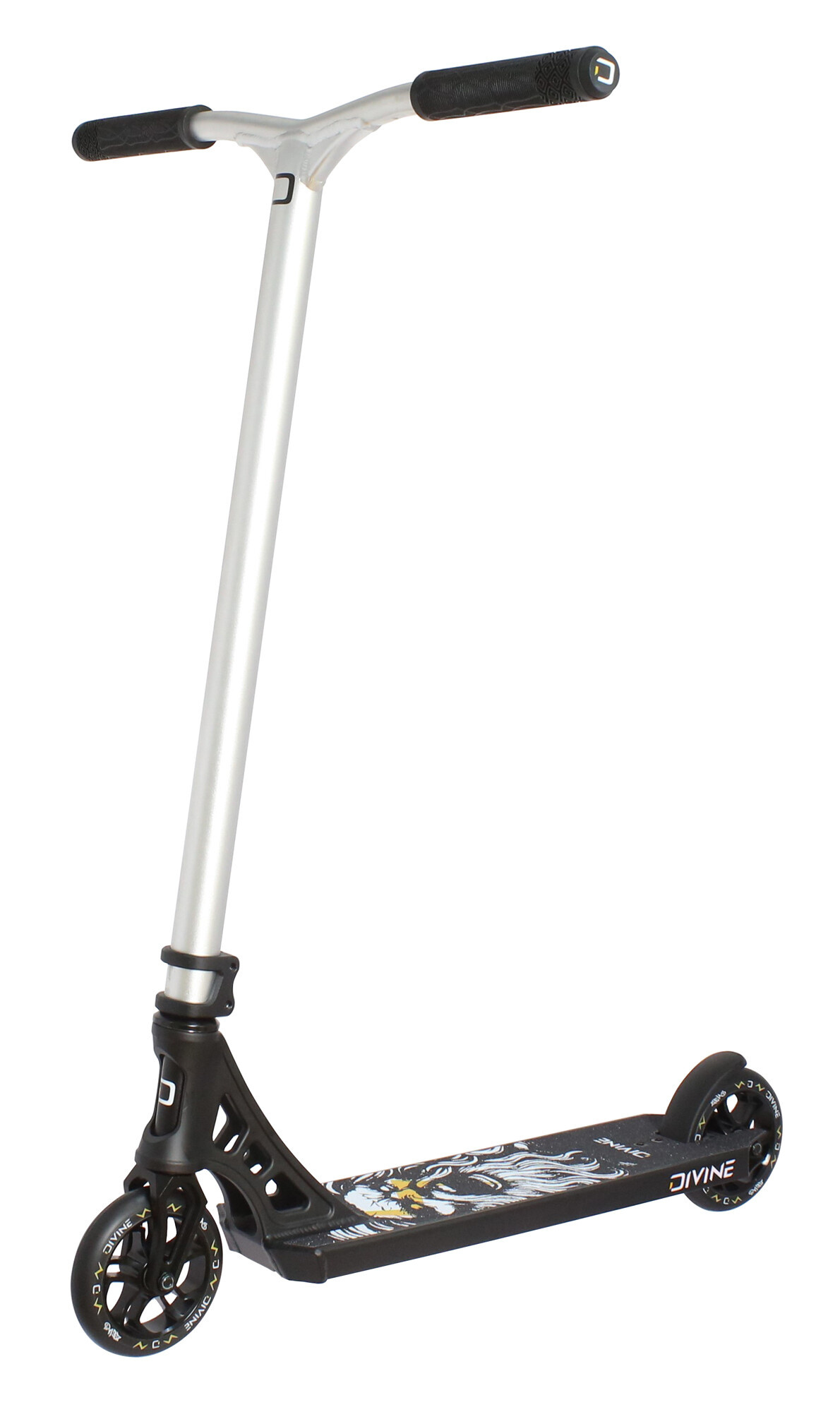 The entire set is held together by a lightweight two-screw clamp and a reliable nylon brake, which does not compromise the clean design or performance of the scooter.Divine Zeus is not just about appearance – although it offers an elegant and stylish design in multiple color variants (e.g. black, silver) – but mainly about the excellently tuned geometry, which makes the scooter easy to handle during a bunny hop, tailwhip, or any other trick. Low weight and thoughtful proportions allow you to ride longer, faster, and more accurately.